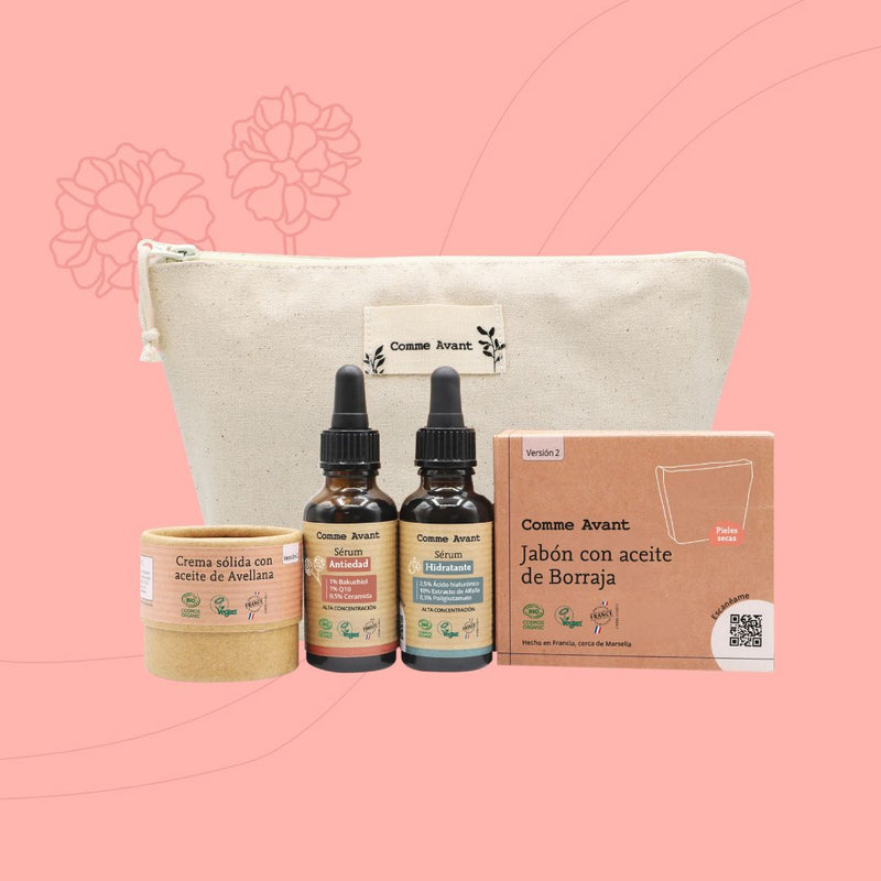 Diseñada para cubrir las necesidades específicas de las pieles maduras desde los primeros signos de la edad, esta rutina se compone de cuatro tratamientos de origen 100% natural: un jabón de aceite de borraja, un sérum hidratante, un sérum antiedad y una crema de aceite de avellana.