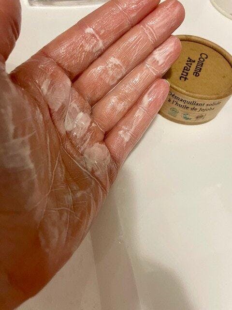 - Nuestro desmaquillante es sólido y, por tanto, concentrado. Espere a que se forme la emulsión blanca al frotar el producto húmedo y recoja un pequeño depósito; una pequeña cantidad es suficiente.