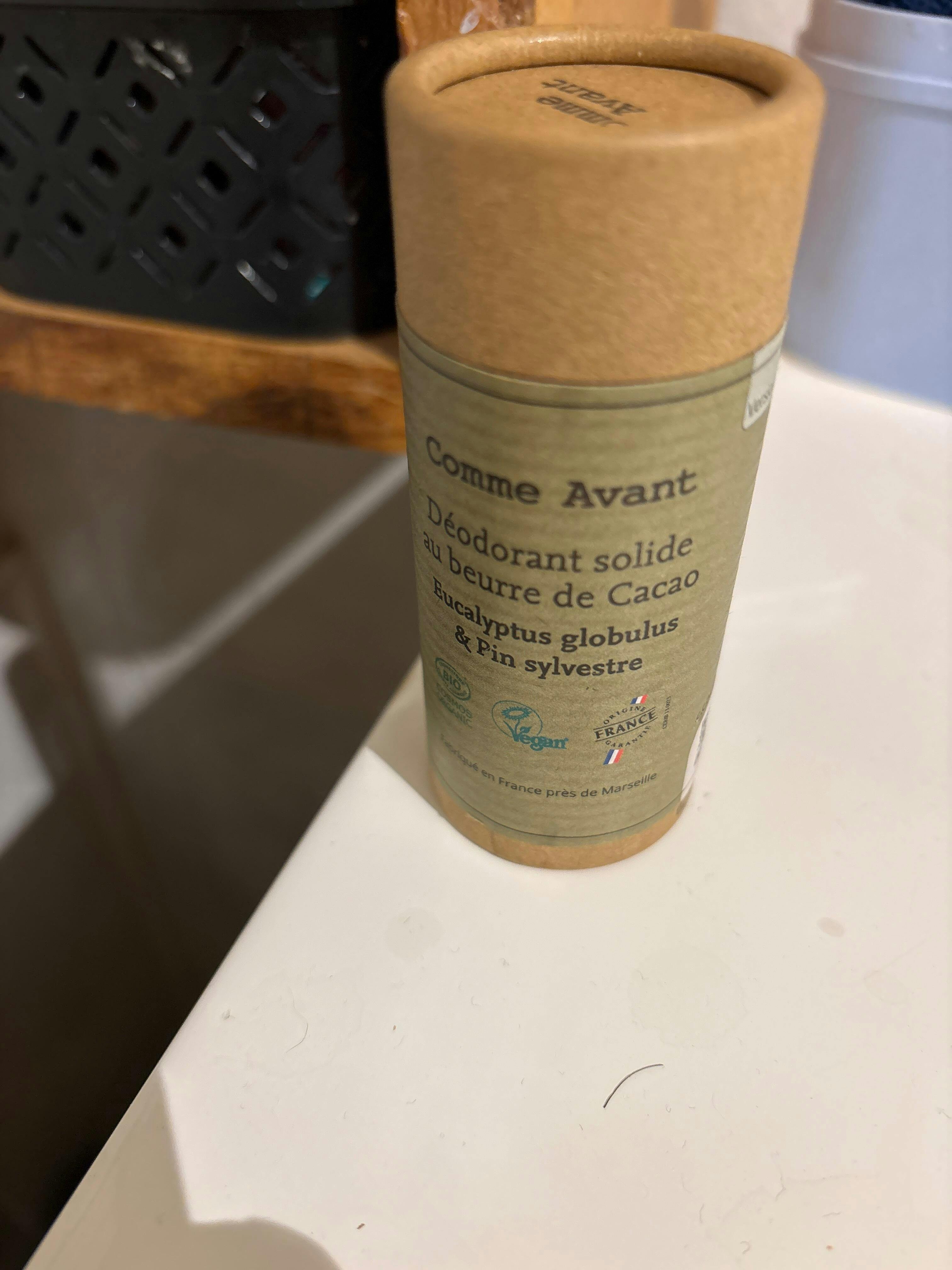 Nuestro desodorante orgánico de eucalipto y pino silvestre es una variación de nuestro desodorante de manteca de cacao pero con aceites esenciales. Aquí está su composición: