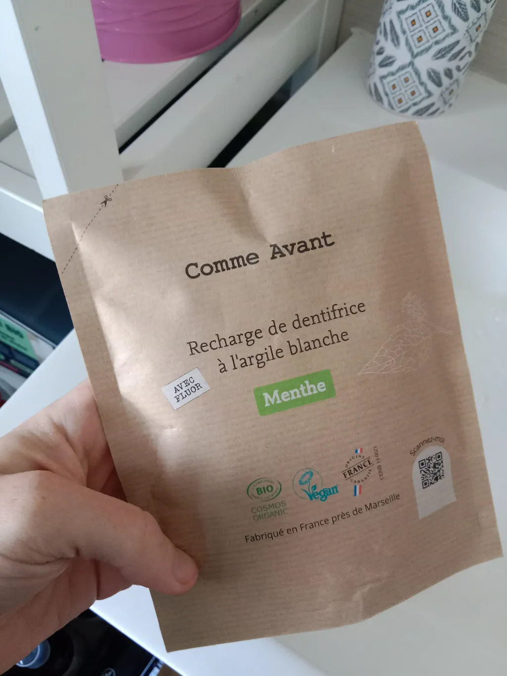 Arcilla blanca: utilizado por sus propiedades de suave abrasión y absorción de impurezas, contribuyendo así a la limpieza y purificación de los dientes. Certificada Cosmos Organic, Origen Francia