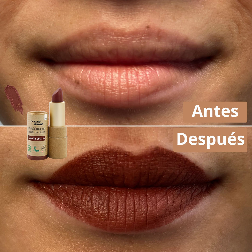 Lista INCI del Pintalabios Caoba Oscuro: Astrocaryum Murumuru Seed Butter, Euphorbia Cerifera Cera, Glyceryl Isostearate, Ricinus Communis Seed Oil, Capryloyl Glycerin / Sebacic Acid Copolymer, CI 77007, CI 77491, Kaolin