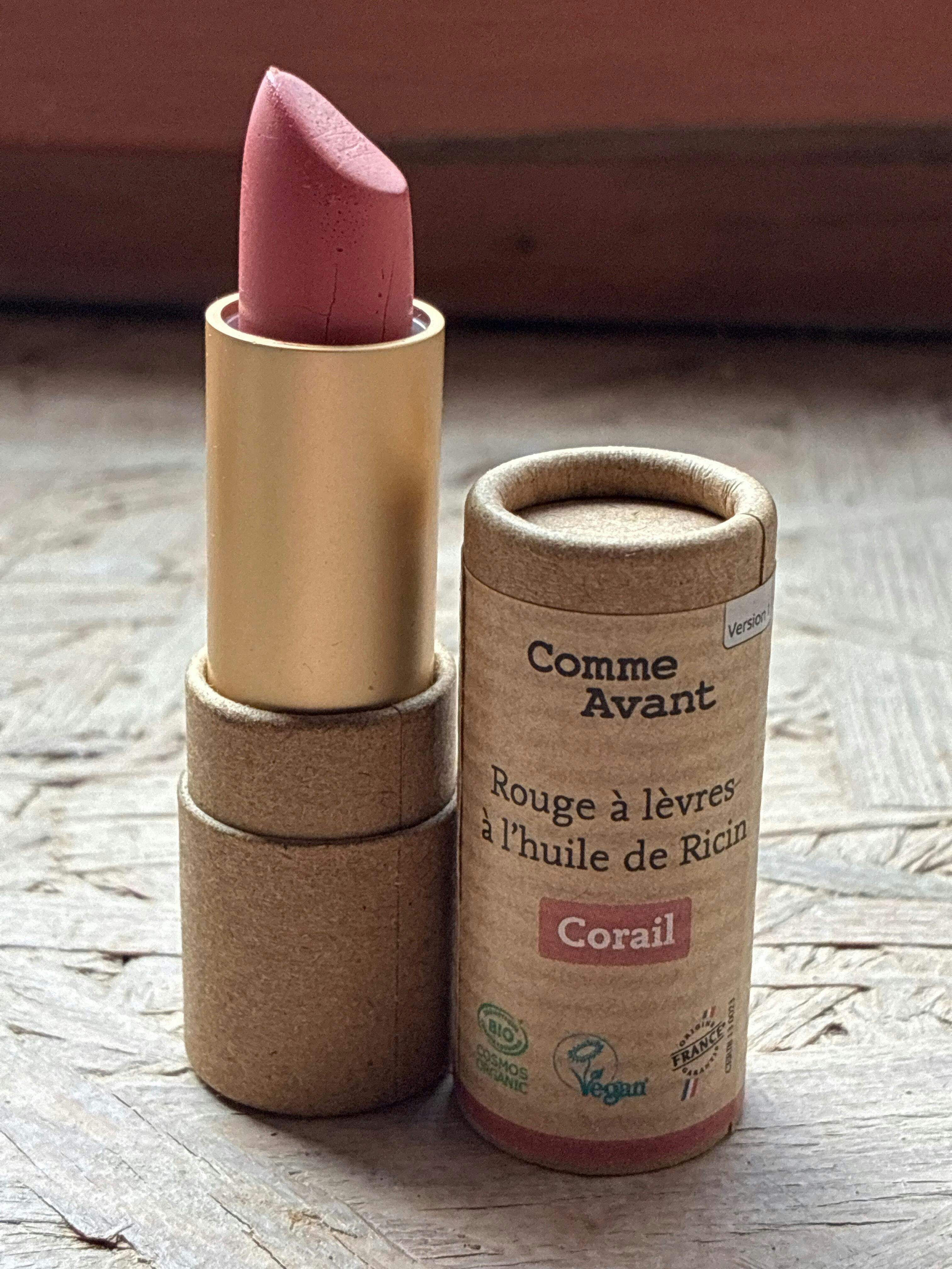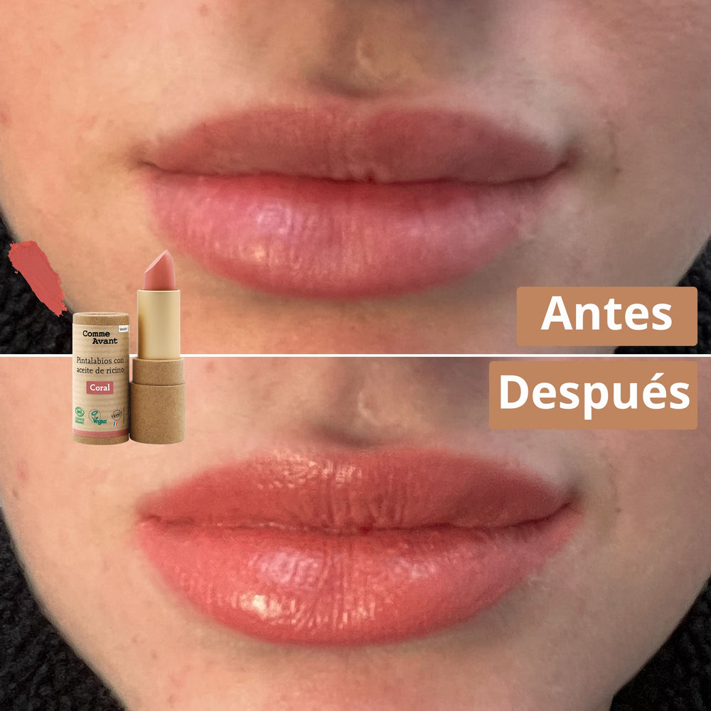 Lista INCI del Pintalabios Coral: Astrocaryum Murumuru Seed Butter, Euphorbia Cerifera Cera, Glyceryl Isostearate, Zinc Oxide, Ricinus Communis Seed Oil, Capryloyl Glycerin / Sebacic Acid Copolymer, CI 77491