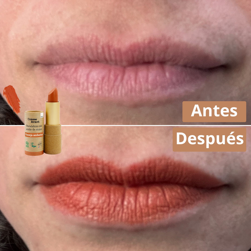 Lista INCI del Pintalabios Naranja Ambarino: Astrocaryum Murumuru Seed Butter, Euphorbia Cerifera Cera, Glyceryl Isostearate, CI 77492, Ricinus Communis Seed Oil, Capryloyl Glycerin / Sebacic Acid Copolymer, CI 77491